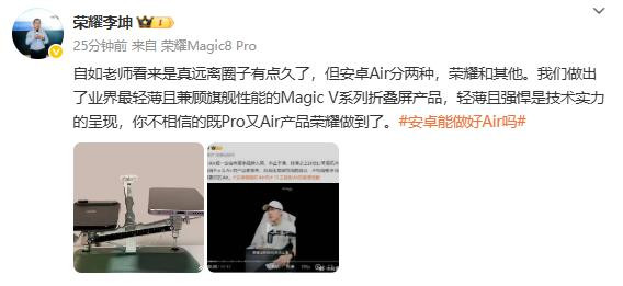 据CNMO了解,此前,王自如发文谈及Air系列产品,他表示:在苹果带动下,一定会有更多品牌入局Air系列赛道,“不止于薄”“轻薄之上” 这类宣传口号如今屡见不鲜,昨天还有品牌预告将发布 “既Pro又Air”的新品,但王自如认为安卓不可能做出比苹果更好的Air产品。