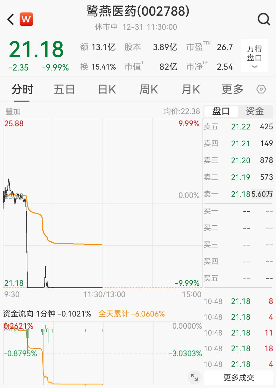 12月31日炒股开户平台,大牛股鹭燕医药(002788.SZ)盘中跳水,1分钟直线跌停,截至午间收盘,报21.18元/股,成交金额超13亿元,换手率超15%。